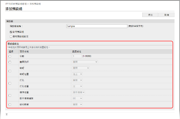 註冊的預設組隨即新增到 [IPP列印的預設組管理] 畫面。