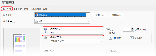 在 [基本設定] 索引標籤上的 [頁面尺寸] 中,選擇文件的紙張尺寸。