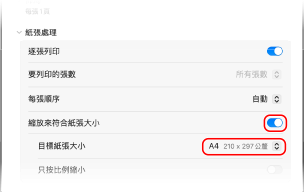 在與 [頁面尺寸] 不同尺寸的紙張上列印時