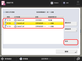 如果顯示 [列印工作清單],請在列印工作清單選擇要取消的工作,然後按下 [取消]。