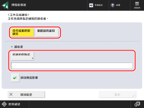 您可以將通訊錄註冊的接收者 (不包括個人位址清單或使用者群組位址清單中的接收者) 或登入使用者電子郵件位址,設定為通知接收者。
