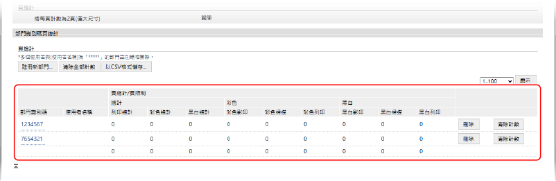啟用部門 ID 管理後,您可以檢視每個部門 ID 的列印和影印頁數。