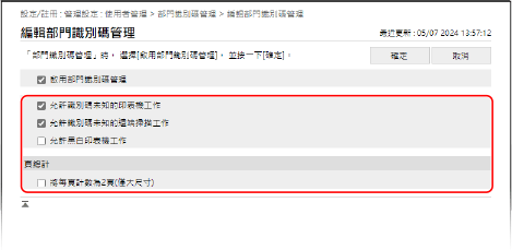 若要允許對未知部門識別碼進行黑白列印和影印,請勾選 [允許黑白影印/列印工作] 核取方塊。