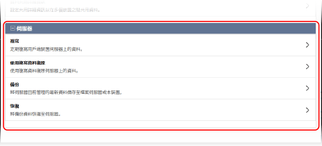 此功能儲存伺服器機器上資料庫管理的最新資料。除了伺服器上的儲存空間之外,資料也可以儲存到網路上的 SMB 伺服器上。