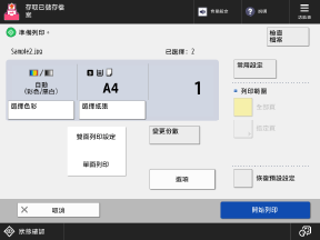 目前設定的列印色彩、要使用的紙張以及列印份數顯示在畫面中央。檢查這些設定以確保正確列印。