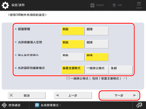 *4您在步驟 67 中將 [認證管理] 和 [使用TLS] 設定為 [開啟] 時,[WebDAV伺服器設定] 中的 [認證類型] 會連結並設定為 [基本]。