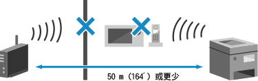 本機和無線區域網路路由器應安裝在裝置之間沒有牆壁或其他障礙物且相距 50 m (164') 範圍內的位置。