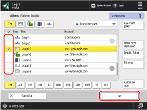 Podeu especificar les destinacions desades a la llibreta d'adreces recuperant la llibreta d'adreces des de les pantalles de lectura (Llegir i enviar) o de fax del tauler de control.