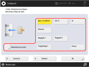 Premeu [Alimentació vora llarga] o [Alimentació vora curta] segons l'orientació dels sobres i seleccioneu la mida del sobre.