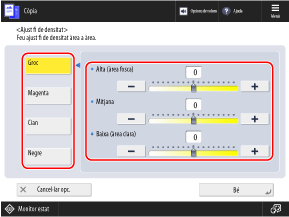 Podeu prémer [Baixa] o [Alta] per a [Tots colors] per moure els controls lliscants de tots els colors al mateix temps.