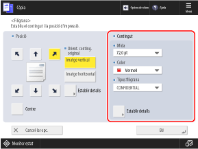 Podeu afegir informació com ara números de pàgina i la data quan feu còpies. També podeu afegir una marca d'aigua com ara "CONFIDENTIAL". També podeu especificar una cadena personalitzada per a la filigrana.