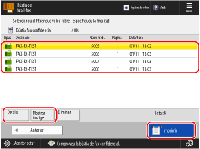 Seleccioneu un fax rebut i premeu [Detalls] per comprovar detalls com ara la mida del fax.