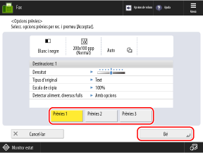 Podeu prémer [Opcions prèvies] per recuperar les opcions utilitzades per enviar faxos anteriorment. La destinació d'enviament també s'aplica juntament amb les opcions que es recuperen.