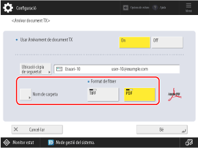Si indiqueu una adreça de correu electrònic o una ubicació d'emmagatzematge de fitxers, els faxos es reenviaran o s'emmagatzemaran com a fitxers TIFF o PDF.