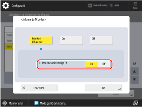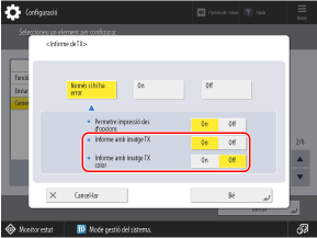 Per imprimir un informe només quan es produeixi un error, seleccioneu [Només si hi ha error]. En aquest cas, establiu [Permetre impressió des d'opcions] en [On] quan vulgueu definir si voleu imprimir l'informe des de la pantalla de lectura o de fax.