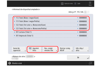 Podeu visualitzar els comptadors i comprovar el nombre de pàgines impreses i copiades, de pàgines llegides i enviades i de pàgines enviades per fax fins al moment mitjançant la impressió en blanc i negre i la impressió en color.