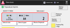 El color d'impressió establert actualment, el paper que s'utilitzarà i el nombre d'impressions es mostren al centre de la pantalla. Comproveu aquests paràmetres per garantir la impressió correcta.