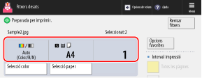 El color d'impressió establert actualment, el paper que s'utilitzarà i el nombre d'impressions es mostren al centre de la pantalla. Comproveu aquests paràmetres per garantir la impressió correcta.