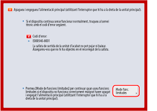Si apareix [Mode de funcions limitades] a la pantalla, podeu prémer-lo i continuar utilitzant l'equip abans de resoldre els problemes. Tanmateix, les funcions que es poden utilitzar són limitades.