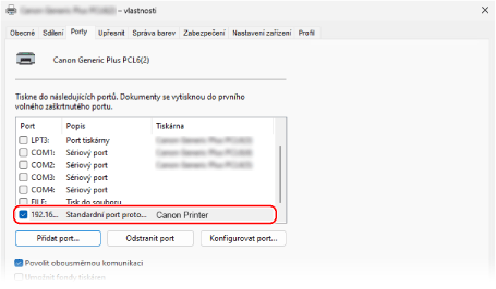 Pokud se po instalaci ovladače tiskárny změní IP adresa přístroje, je třeba přidat nový port. Přidání portu