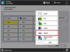 Skupiny můžete pod tlačítka rychlé volby uložit také na obrazovce pro skenování (Skenovat a Odeslat) nebo faxování.