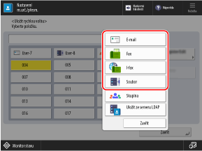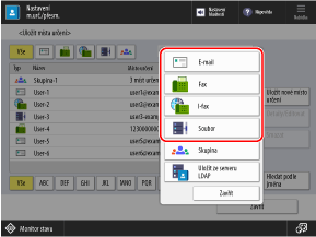 Na obrazovce skenování (Skenovat a Odeslat) nebo faxu můžete stisknutím [Adresář] zaregistrovat cíl z obrazovky adresáře.