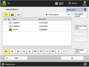 Když na obrazovce pro skenování nebo faxování vyvoláte adresář, zobrazí se příslušná obrazovka uvedená níže.
