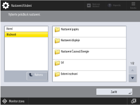 Tato obrazovka se zobrazí po stisknutí tlačítka [ Nastavení/Uložení] na ovládacím panelu. Tuto obrazovku použijte ke konfiguraci různých nastavení přístroje. [Nastavení/Uložení] Seznam nabídky