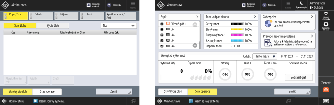 Když vyberete [Stav/Výpis úloh], můžete zkontrolovat stav a historii zpracování každé funkce a zbývající množství spotřebního materiálu a dílů.