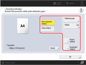 Pokud je vložen papír velikosti, která není automaticky rozpoznána, nebo je i po opětovném vložení papíru rozpoznána jiná velikost, stiskněte [Standardní velikost] a vyberte velikost vloženého papíru.