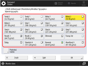 Když zaregistrujete informace (velikost a typ) o často používaném papíru jako oblíbený papír, můžete tyto informace vyvolat na obrazovce nastavení papíru a rychle zadat velikost a typ papíru.