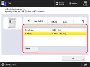 Obrazovka kopírování se zobrazí po stisknutí [Kopie] na obrazovce [Hlavní obrazovka] ovládacího panelu.