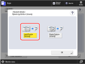Můžete také vytvářet oboustranné kopie, kde se levá a pravá stránka originálu zkopírují na obě strany jednoho listu papíru, nebo oboustranné kopie, kde se přední a zadní strana levé nebo pravé stránky rozevřeného originálu zkopírují na obě strany jednoho listu papíru.