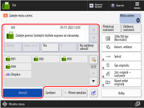 Na ovládacím panelu stiskněte tlačítko [Fax] na obrazovce [Hlavní obrazovka]. Obrazovka [Hlavní obrazovka]