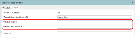 V této části je popsán příklad zadání faxového čísla. Místo určení zaregistrované v adresáři můžete zadat na kartě [Vybrat cíl].