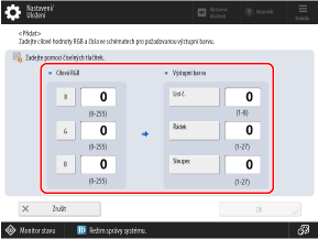 Nahlédněte do tabulky vytištěné v kroku 1 a do [List č.], [Řádek] a [Sloupec] zadejte čísla pro barvy, které chcete reprodukovat.
