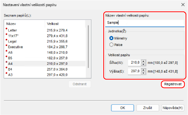 Zadejte název papíru vlastní velikosti i jeho rozměr a klikněte na tlačítko [Registrovat].