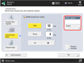 Pokud nastavíte velikost předlohy na větší, než je skutečná velikost předlohy, nebo pokud skenujete stránky tlusté knihy, mohou se na okrajích předlohy objevit tmavé okraje a stíny. Nastavení můžete nakonfigurovat tak, aby se při skenování vymazaly okraje nebo stíny. Na originálu můžete také vymazat děrovací otvory.