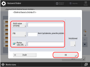 Stiskněte [Nastavení funkcí] [Přijmout/Přesměrovat] [Běžná nastavení] [Nastavit fax./I-fax. schránku] [Nastavit/Uložit důvěrné faxové schránky].