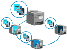Můžete synchronizovat personalizovaná data více multifunkčních přístrojů Canon v síti. Přihlášený uživatel tak může jednoduše používat stejná nastavení na každém multifunkčním přístroji. Uživatel může například používat tlačítko Adresář nebo Osobní zaregistrované na jednom multifunkčním přístroji i s ostatními přístroji.