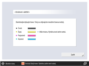 Dokud oznamovací obrazovku nesmažete, zobrazí se při každém ukončení režimu spánku nebo zapnutí hlavního napájení. Chcete-li smazat oznamovací obrazovku, proveďte operaci [Smazat chybu Zbývající toner]. [Smazat chybu Zbývající toner]