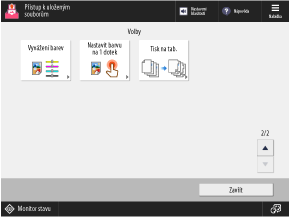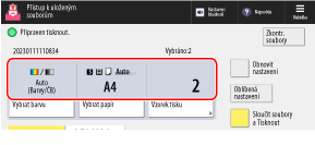 Uprostřed obrazovky se zobrazí aktuálně nastavená barva tisku, použitý papír a počet výtisků. Zkontrolujte tato nastavení, aby byla zajištěna správnost tisku.