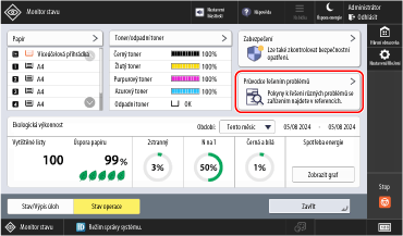Informace podpory k řešení problémů s tiskem, faxováním a odesíláním naskenovaných dat lze zkontrolovat v nabídce [Průvodce řešením problémů] v provozním stavu přístroje.