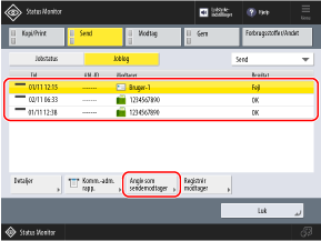 *Hvis afsendelsesloggen er begrænset, så kun login-brugere kan få adgang til deres egne job i loggen, skal du logge på maskinen, før du henter og angiver modtagere fra login-brugerens afsendelseslog.