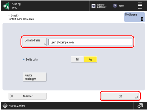 Når du angiver en modtager ved at vælge et scanningsjob i loggen, kan du trykke på [Næste modtager] og angive en yderligere modtager af samme type ved direkte at indtaste oplysningerne.