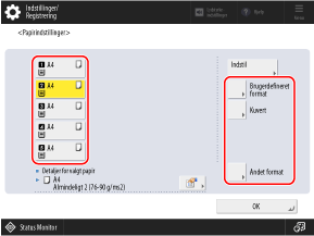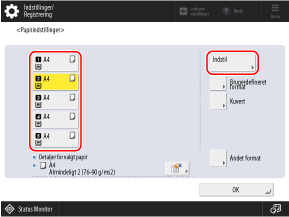 Som standard er papirtypen indstillet til Plain 1 eller Plain 2. Når papir af en anden type er ilagt, eller størrelsen vist på betjeningspanelet er forskellig fra det ilagte papir, skal du ændre papirindstillingerne.