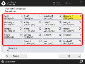 Tryk på [Detalj. indstil.], og vælg papirtypen fra den viste liste.