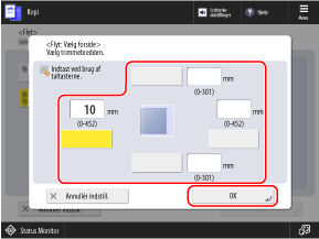 Du kan justere margener omkring den kopierede original, når du kopierer til en større papirstørrelse end originalen, eller når du kopierer i en reduceret størrelse.
