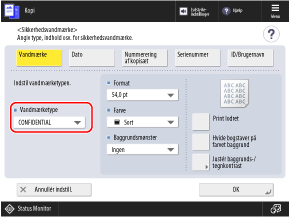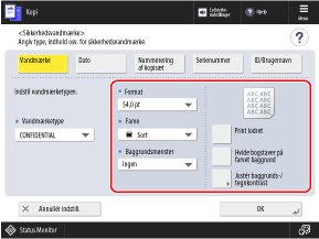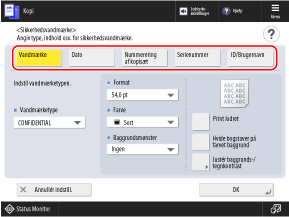 Indstillingerne, der er konfigureret på skærmen [Sikkerhedsvandmærke], anvendes på prøveprintets tegnformat.