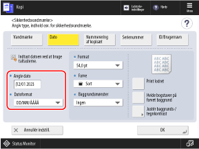 Som standard indtastes datoen, der er indstillet på maskinen. Vil du tilføje en anden dato, skal den indtastes ved hjælp af de numeriske taster.